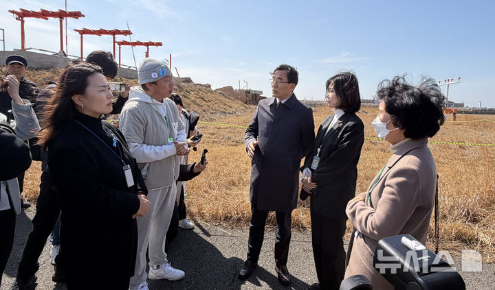 [무안=뉴시스] 이영주 기자 = 전성환(오른쪽 두번째) 대통령비서실 경청통합수석이 20일 오후 전남 무안국제공항 활주로 로컬라이저를 찾아 12·29 무안공항 제주항공 여객기 참사 유가족협의회 관계자와 이야기를 나누고 있다. (사진 = 독자 제공) 2026.03.20. [email protected]