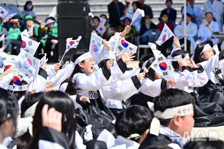 [사천=뉴시스] 차용현 기자 = 20일 오전 경남 사천시 사천초등학교에서 열린 제 23회 기미년 독립만세운동 재현행사에서 사천초교 재학생들과 선생님들이 만세운동 퍼포먼스를 진행하고 있다. 이날 행사는 기미년 당시 사천초등학교 학생들이 축구경기를 하던 중 첫 골이 터지는 것을 신호로 가슴에 품었던 태극기를 꺼내 대한민국 만세를 외치는 상황을 재현했다. 2026.03.20. [email protected]