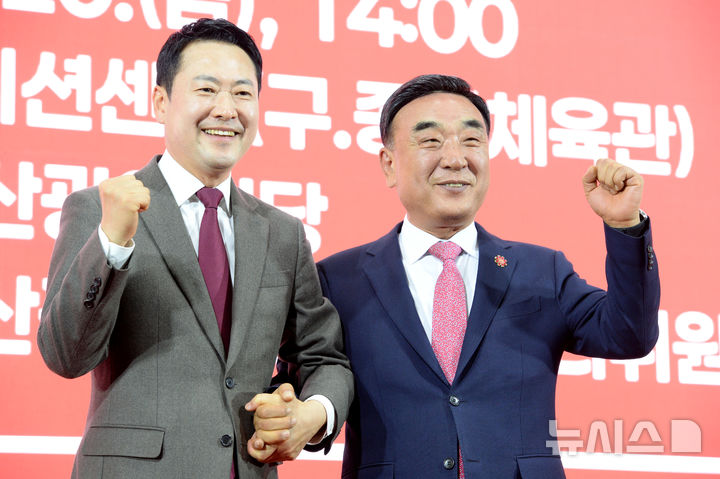 [울산=뉴시스] 배병수 기자 = 장동혁(왼쪽) 국민의힘 당대표가 20일 울산 남구 종하 이노베이션센터에서 열린 국민의힘 울산시당 지방선거 출마예정자 정견 발표회에서 김두겸 울산시장 출마예정자와 승리를 다짐하고 있다. 2026.03.20. [email protected].