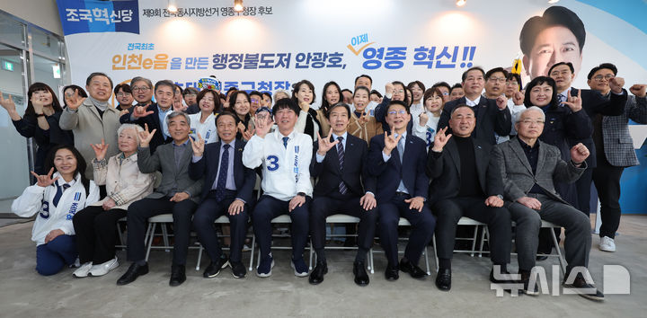 [인천=뉴시스] 전진환 기자 = 조국(앞줄 오른쪽 네번째) 조국혁신당 대표가 20일 오후 인천 중구의 안광호(앞줄 왼쪽 다섯번쨰) 영종구청장 후보의 선거사무소 개소식에 참석해 지지자들과 기념촬영을 하고 있다. 2026.03.20. [email protected]