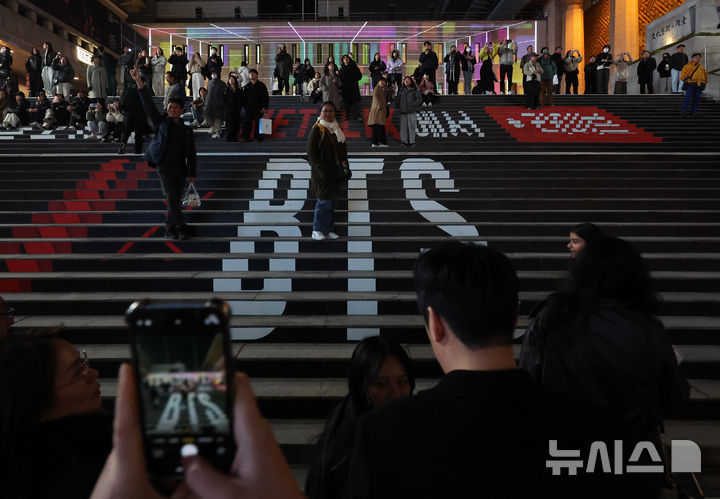 [서울=뉴시스] 배훈식 기자 = BTS(방탄소년단) 완전체 컴백 광화문 공연을 하루 앞둔 20일 오후 서울 종로구 세종문화회관 계단에서 공연을 기다리는 아미들이 기념사진을 찍고 있다. 2026.03.20. [email protected]