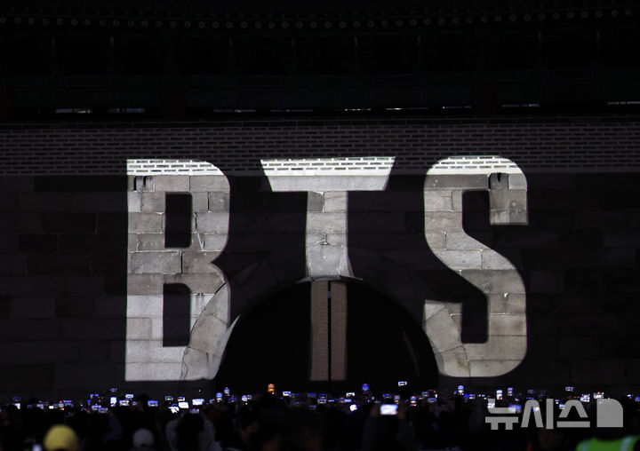 [서울=뉴시스] 배훈식 기자 = BTS(방탄소년단) 완전체 컴백 광화문 공연을 하루 앞둔 20일 오후 서울 중구 숭례문에서 BTS 새 앨범 '아리랑'(ARIRANG) 미디어 파사드가 펼쳐지고 있다. 2026.03.20. [email protected]