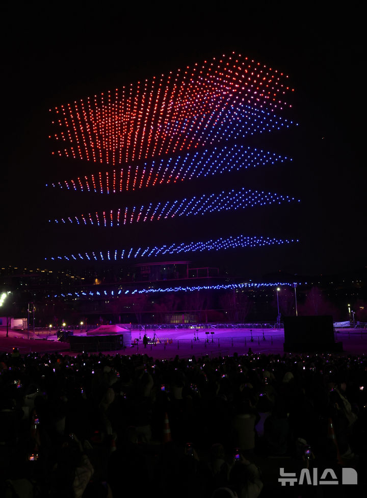 [서울=뉴시스] 박주성 기자 = 방탄소년단(BTS) 컴백 공연을 하루 앞둔 20일 오후 서울 광진구 뚝섬 한강공원에서 'BTS 컴백 드론 라이트쇼'가 진행되고 있다. 2026.03.20. [email protected]