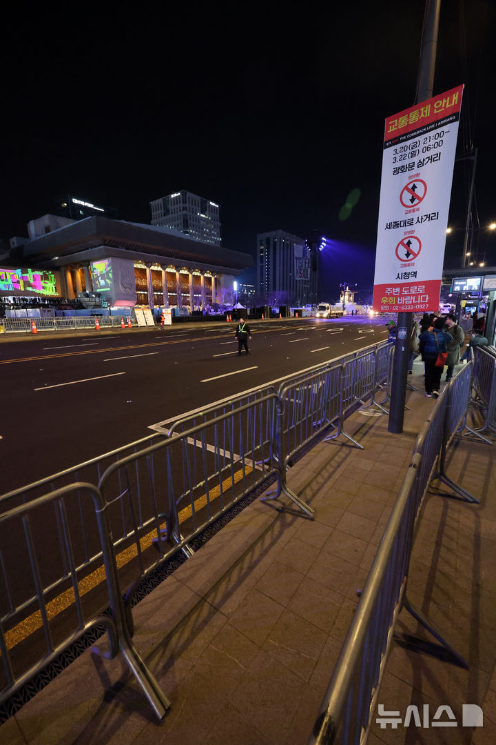 [서울=뉴시스] 배훈식 기자 = BTS(방탄소년단) 완전체 컴백 광화문 공연을 하루 앞둔 20일 오후 서울 종로구 세종대로가 전면 통제돼 있다. 이번 전면 통제(광화문 삼거리~시청역)는 오는 22일 오전 6시 까지 계속된다. 2026.03.20. [email protected]