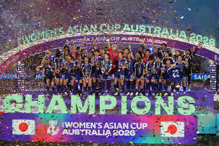 [시드니=AP/뉴시스] 일본 여자축구 대표팀 선수들이 21일(현지 시간) 호주 시드니의 스타디움 오스트레일리아에서 열린 2026 아시아축구연맹(AFC) 여자 아시안컵 정상에 올라 트로피를 들고 환호하고 있다. 일본은 결승에서 호주를 1-0으로 꺾고 우승하며 대회 통산 3번째 우승컵을 들어 올렸다. 2026.03.21.