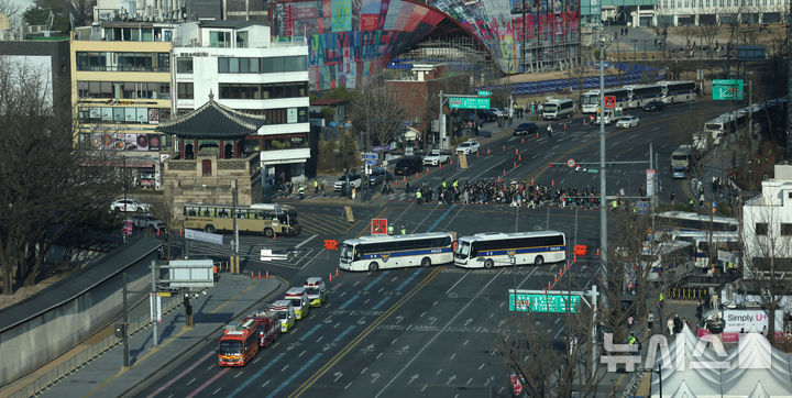 [서울=뉴시스] 김선웅 기자 = 21일 서울 종로구 광화문광장에서 열리는 BTS 컴백 공연을 앞두고 경복궁 앞 도로 통행이 통제되고 있다. 2026.03.21. [email protected]
