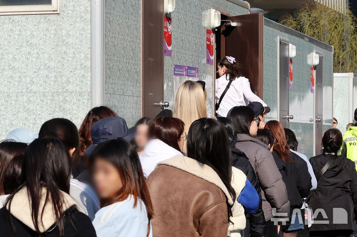 [서울=뉴시스] 조성우 기자 = 방탄소년단(BTS) 컴백 공연 당일인 21일 서울 종로구 광화문광장 인근 이동식 화장실 앞에서 시민들이 줄을 서 있다. 2026.03.21. [email protected]