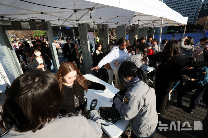 [서울=뉴시스] 조성우 기자 = 방탄소년단(BTS) 컴백 공연 당일인 21일 서울 종로구 광화문광장에서 팬들이 검색대를 통과하고 있다. 2026.03.21. [email protected]