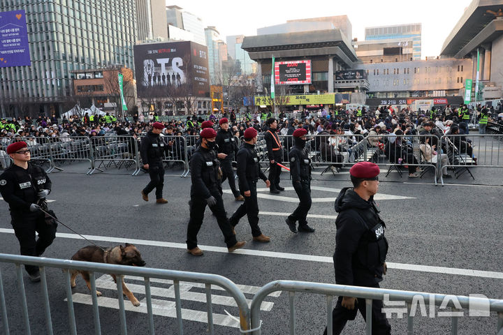 [서울=뉴시스] 조성우 기자 = 방탄소년단(BTS) 컴백 공연 당일인 21일 서울 종로구 광화문광장에서 경찰특공대가 경계근무를 서고 있다. 2026.03.21. [email protected]