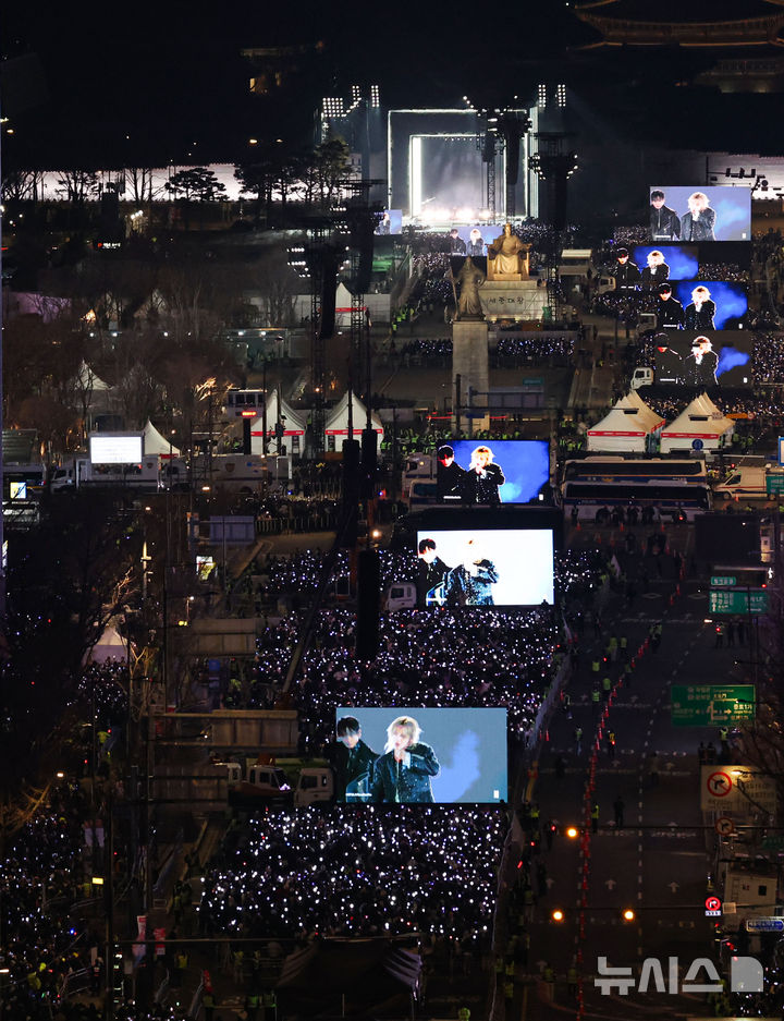 [서울=뉴시스] 권창회 기자 = 방탄소년단(BTS)이 21일 서울 종로구 광화문광장에서 'BTS 컴백 라이브: 아리랑(ARIRANG)' 공연을 하고 있다. 2026.03.21. [email protected]