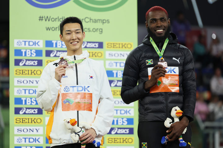 [토룬=AP/뉴시스] 우상혁(왼쪽)이 21일(현지 시간) 폴란드 토룬에서 열린 2026 세계실내육상경기선수권 남자 높이뛰기에서 3위를 차지한 후 시상대에 올라 동메달을 목에 걸고 포즈를 취하고 있다. 디펜딩 챔피언 우상혁은 2m26을 넘어 공동 3위를 기록했다. 2026.03.22.