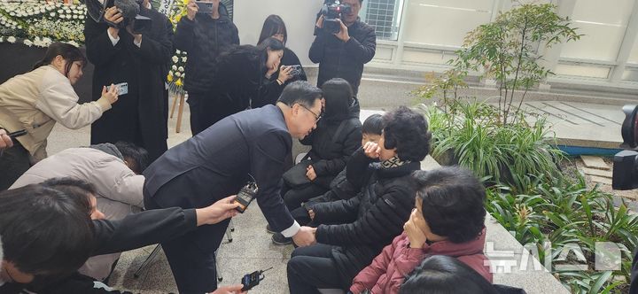 [대전=뉴시스]곽상훈 기자=이장우 대전시장이 22일 대전 자동차 부품공장 참사 합동분향소가 마련된 대전시청 1층 분향소에서 희생자에 분향한 후 유가족들을 위로하고 있다. 2026. 03. 22 [email protected]