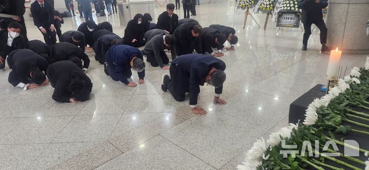 [대전=뉴시스]곽상훈 기자=20일 불이 나 14명이 숨지고 70여명의 부상자를 낸 대전 자동차 부품공장(안전공업) 임직원들이 대전시청 합동분향소에서 큰 절을 올리며 분향하고 있다. 2026. 03. 22. kshoon0663@newsis,com