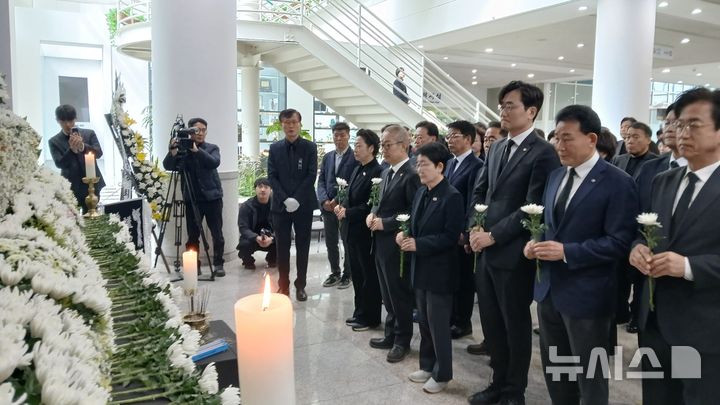 [대전=뉴시스] 조명휘 기자 = 더불어민주당 대전시당 소속 국회의원들과 당원 등이 22일 오전 대전시청 로비에 마련된 문평동 자동차 부품 제조공장 화재 희생자 합동분향소를 찾아 헌화하고 있다. 2026.03.22. [email protected]