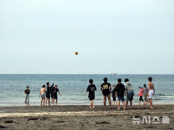 [제주=뉴시스] 김수환 기자 = 22일 오후 제주시 삼양해수욕장에서 10대 청소년들이 공놀이를 하고 있다. 이날 제주시 최고기온은 16.2도, 서귀포시 최고기온은 18.9도로 평년 기온(13~15도)을 웃돌았다. 2026.03.22. [email protected]