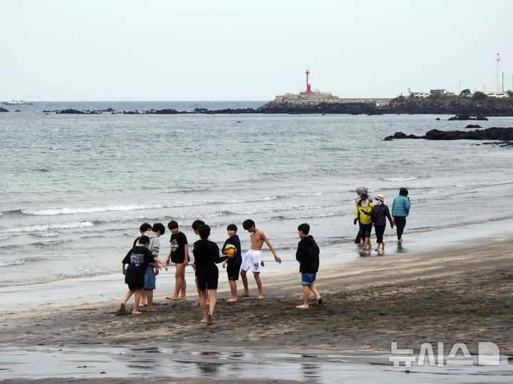 [제주=뉴시스] 김수환 기자 = 22일 오후 제주시 삼양해수욕장에서 공놀이를 하고 있는 청소년들 뒤로 시민들이 맨발 산책을 하고 있다. 이날 제주시 최고기온은 16.2도, 서귀포시 최고기온은 18.9도로 평년 기온(13~15도)을 웃돌았다. 2026.03.22. [email protected]