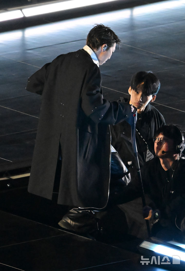 [서울=뉴시스] 사진공동취재단 = 방탄소년단(BTS) RM이 21일 서울 종로구 광화문광장에서 컴백을 기념해 'BTS 컴백 라이브 : 아리랑' 공연을 마친 뒤 목발을 짚고 무대를 내려가고 있다. 2026.03.22. [email protected]
