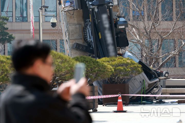 [서울=뉴시스] 고승민 기자 = 22일 서울 여의도 국회 본청에서 소형 크레인 차량이 대형 크레인에 의해 옮겨지던 중 사고가 발생, 줄에 그대로 매달려 있다. 2026.03.18. [email protected]