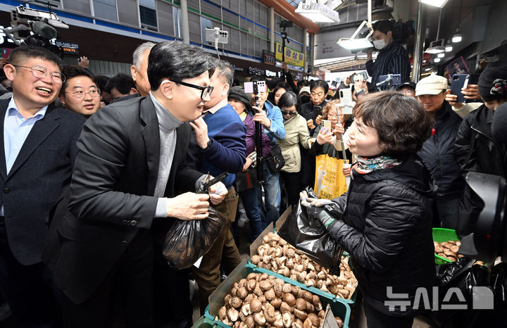 [서울=뉴시스] 정병혁 기자 = 한동훈 전 국민의힘 대표가 22일 서울 동대문구 경동시장을 찾아 시장 상인들과 인사를 나누고 있다. (공동취재) 2026.03.22. [email protected]