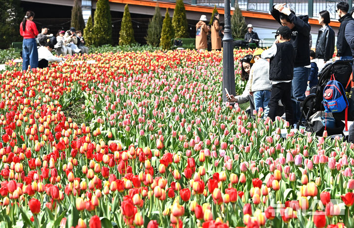 [용인=뉴시스] 김종택 기자 = 포근한 날씨를 보인 22일 튤립축제가 열리고 있는 경기 용인시 에버랜드를 찾은 시민들이 활짝 핀 튤립 꽃길을 거닐며 봄 기운을 만끽하고 있다. 2026.03.22. [email protected]