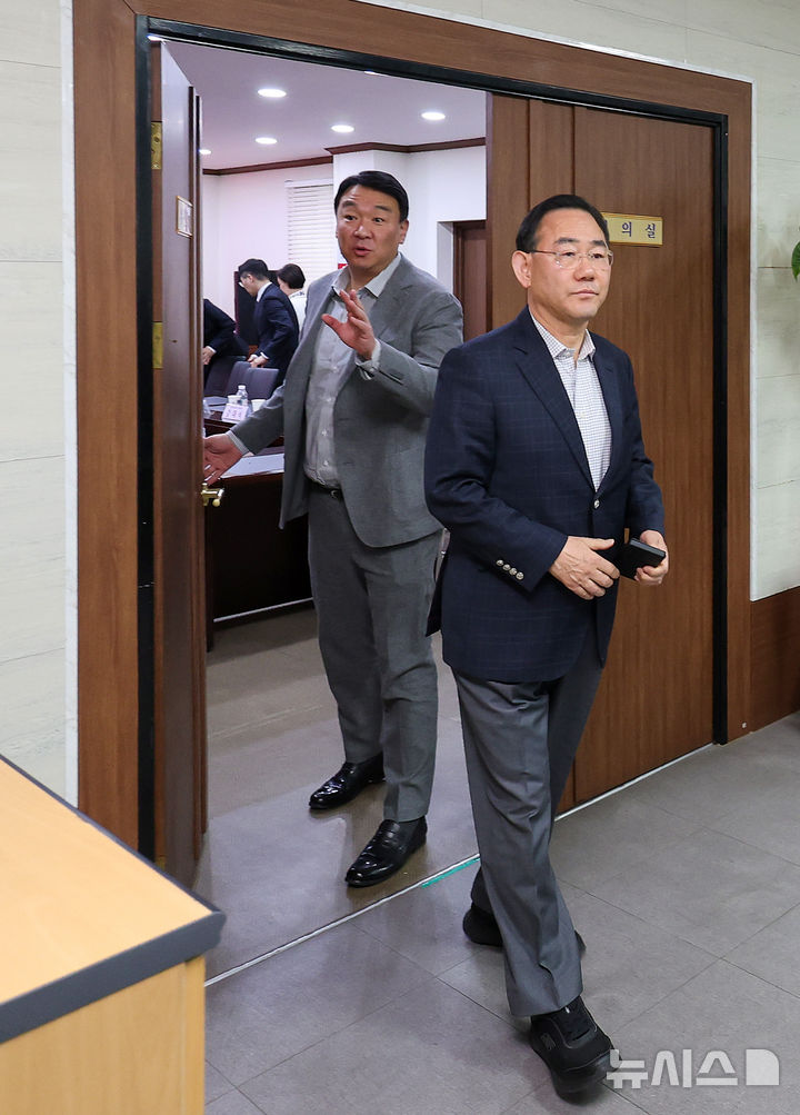 [대구=뉴시스] 이무열 기자 = 주호영 국민의힘 의원이 22일 대구 수성구 국민의힘 대구시당에서 열린 대구 국회의원 연석회의를 마친 뒤 회의실을 나오고 있다. 202603.22. [email protected]