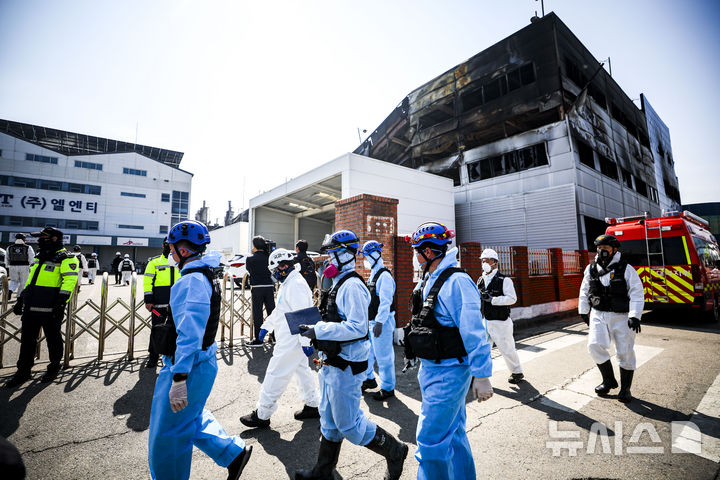 [대전=뉴시스] 정병혁 기자 = 23일 대전 대덕구 안전공업 공장 화재 현장에서 유가족 대표를 비롯한 국과수, 소방, 경찰 등 유관기관 관계자들이 합동감식을 위해 이동하고 있다. 2026.03.23. [email protected]