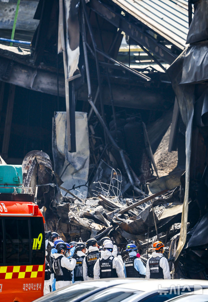[대전=뉴시스] 정병혁 기자 = 23일 대전 대덕구 안전공업 공장 화재 현장에서 유가족 대표를 비롯한 국과수, 소방, 경찰 등 유관기관 관계자들이 합동감식을 하고 있다. 2026.03.23. [email protected]
