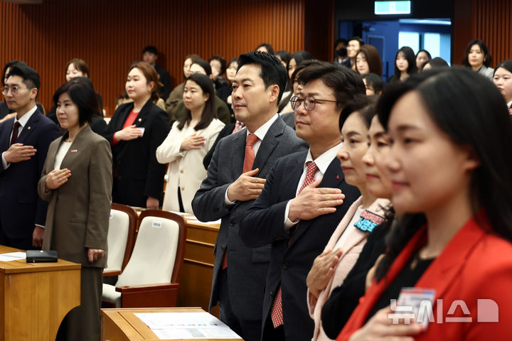 [서울=뉴시스] 고승민 기자 = 국민의힘 장동혁 대표와 서명옥 중앙여성위원장 등 참석자들이 23일 서울 여의도 국회박물관에서 열린 중앙차세대여성위원회 발대식에서 국민의례를 하고 있다. 2026.03.23. [email protected]