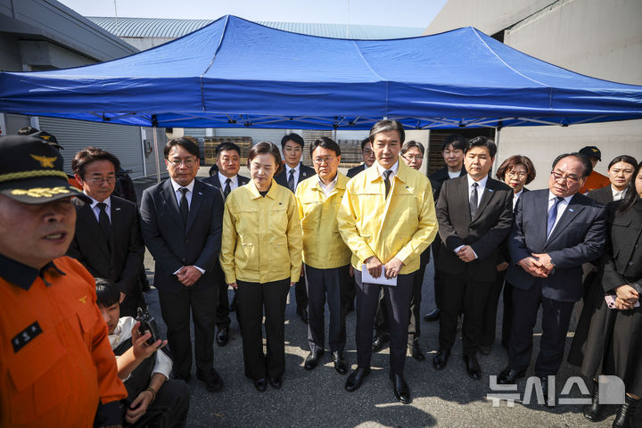 [대전=뉴시스] 정병혁 기자 = 조국 조국혁신당 대표를 비롯한 소속 의원들이 23일 대전 대덕구 안전공업 공장 화재 현장을 찾아 관련 보고를 받고 있다. 2026.03.23. [email protected]