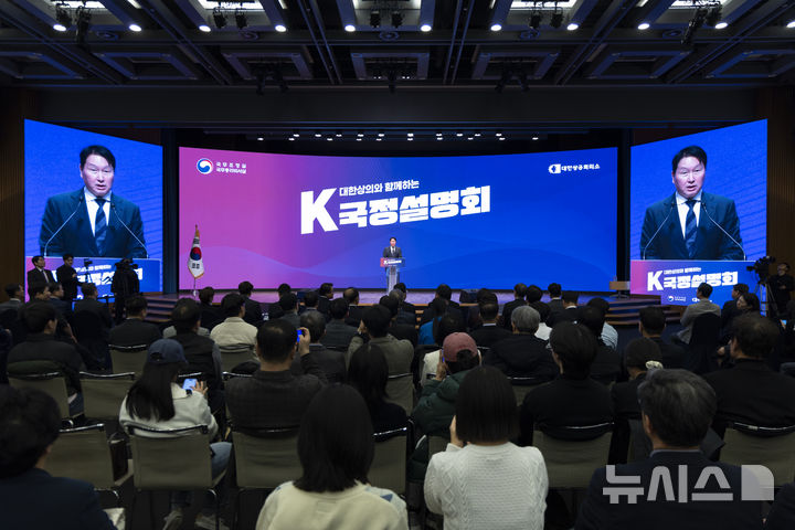 [서울=뉴시스] 김근수 기자 = 최태원 대한상공회의소 회장이 23일 서울 중구 대한상공회의소에서 열린 K-국정설명회에서 기조연설을 하고 있다. 2026.03.23. [email protected]