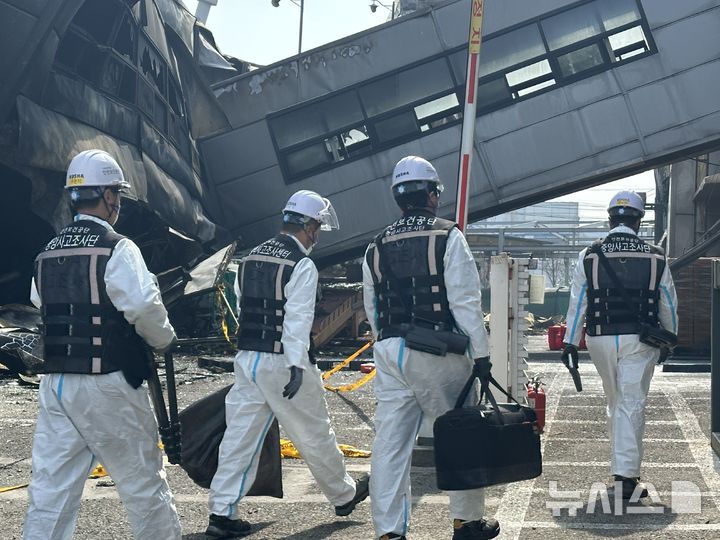 [대전=뉴시스] 김도현 기자 = 안전보건공단과 노동청 관계자들이 24일 오전 대전 대덕구 안전공업 공장에서 자체 감식을 위해 화재 현장으로 들어가고 있다. [email protected]