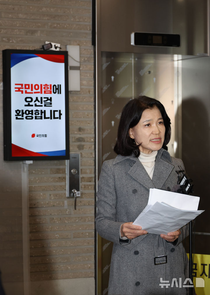 [서울=뉴시스] 김금보 기자 = 지방선거 국민의힘 대구시장 후보 공천 경선에서 컷오프 된 이진숙 전 방송통신위원회 위원장이 24일 오후 서울 여의도 국민의힘 중앙당사 로비에서 기자회견을 하고 있다. 2026.03.24. [email protected]