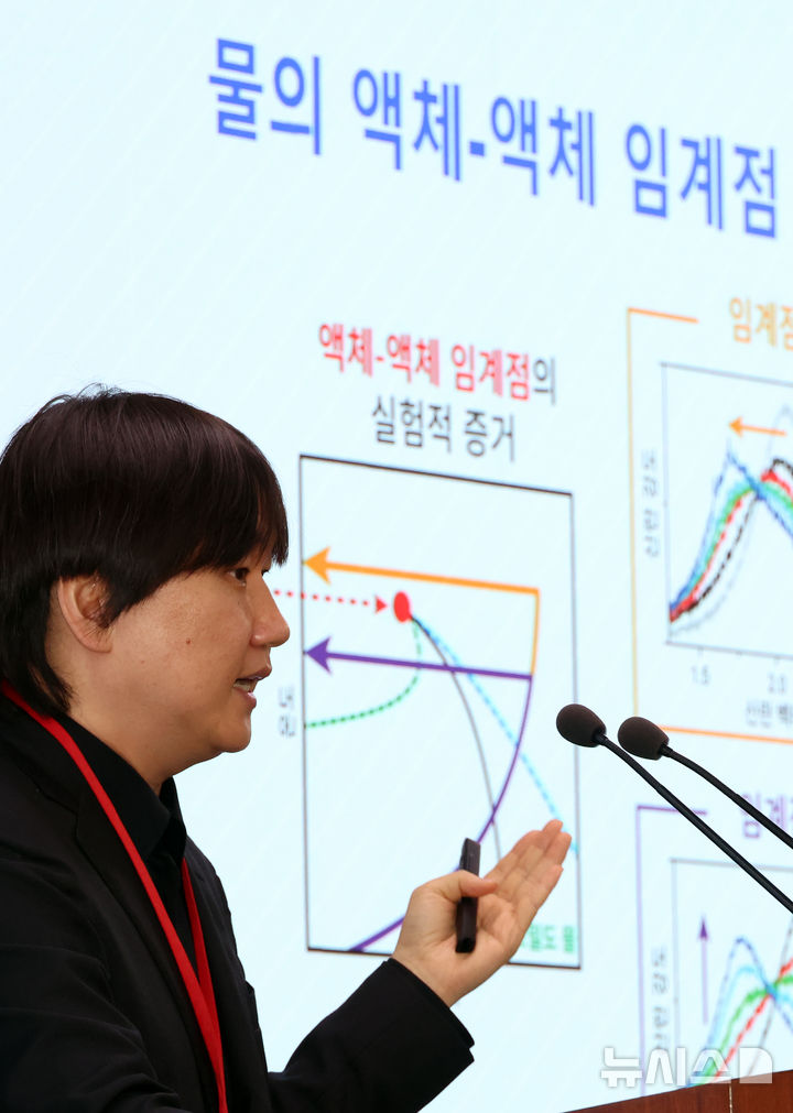 [세종=뉴시스] 강종민 기자 = 김경환 포항공대 교수가 지난 24일 세종시 정부세종청사에서 물의 '액체-액체 임계점’을 세계 최초로 관측했다고 밝히고 있다.