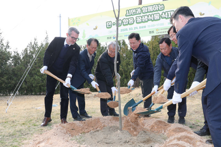 [서울=뉴시스] 김진아 기자 = 이승돈 농촌진흥청장이 24일 경기 안성시 농협안성팜랜드에서 열린 ‘민·관 합동 꿀샘식물 식재행사’에 참석해 기념식수를 하고 있다. (사진=농촌진흥청 제공) 2026.03.24. [email protected] *재판매 및 DB 금지
