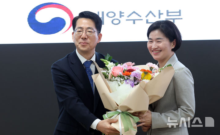 [부산=뉴시스] 하경민 기자 = 황종우 해양수산부 장관이 25일 부산 동구 해양수산부 별관 대회의실에서 열린 취임식에 참석, 직원 대표로부터 축하 꽃다발을 받고 있다. 2026.03.25. [email protected]