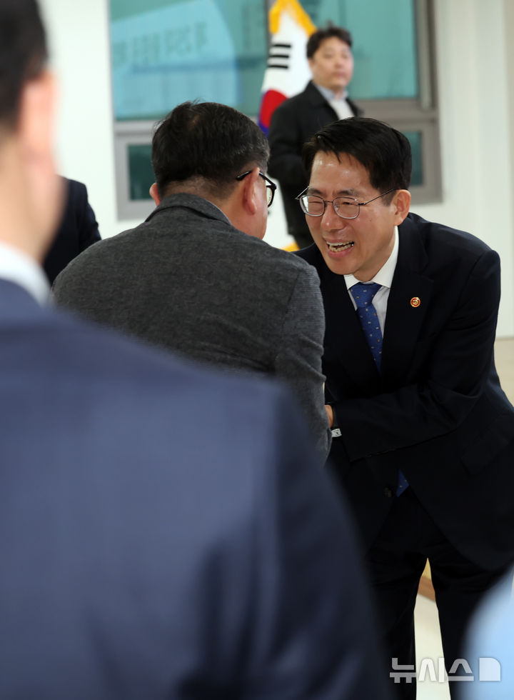 [부산=뉴시스] 하경민 기자 = 황종우 해양수산부 장관이 25일 부산 동구 해양수산부 별관 대회의실에서 취임식이 끝난 뒤 직원들과 인사하고 있다. 2026.03.25. [email protected]