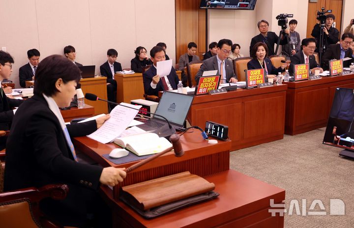 [서울=뉴시스] 조성봉 기자 = 서영교 국회 국정조사특위 위원장이 25일 오전 서울 여의도 국회에서 열린 윤석열 정권 정치검찰 조작기소 의혹 사건 진상규명 국정조사특별위원회에서 의사봉을 두드리고 있다.2026.03.25. [email protected]