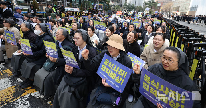 [서울=뉴시스] 김선웅 기자 = 25일 서울 종로구 옛 주한 일본대사관 인근 평화의 소녀상 앞에서 열린 제1745차 일본군 성노예제 문제해결을 위한 수요시위에서 참가자들이 일본의 사죄와 배상을 촉구하고 있다. 2026.03.25. [email protected]