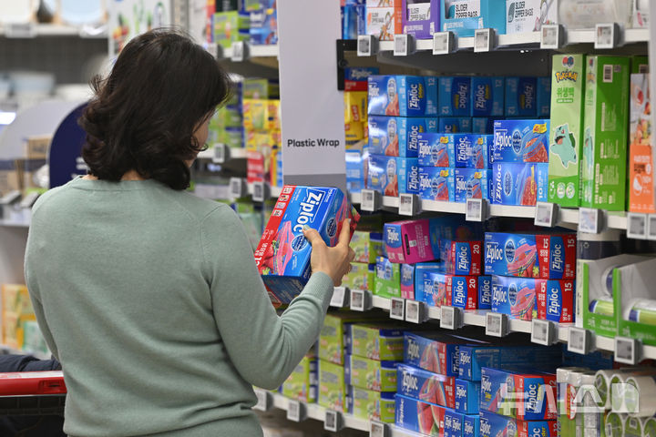 [광주=뉴시스] 이영주 기자 = 중동전쟁 여파로 종량제봉투 품귀와 석유화학제품들의 가격 상승 우려가 예상되는 25일 오전 광주 한 대형마트에서 고객이 일회용 비닐을 들여다보고 있다. 2026.03.25. [email protected]