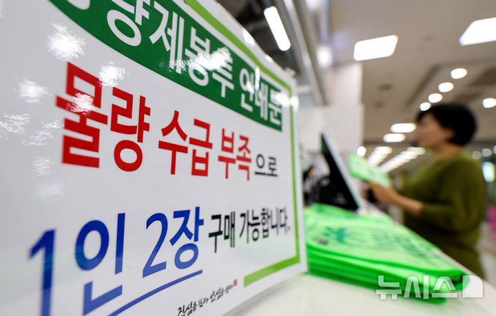 [대구=뉴시스] 이무열 기자 = 25일 대구 한 대형마트에 종량제봉투 구매 제한 안내문이 붙어 있다.