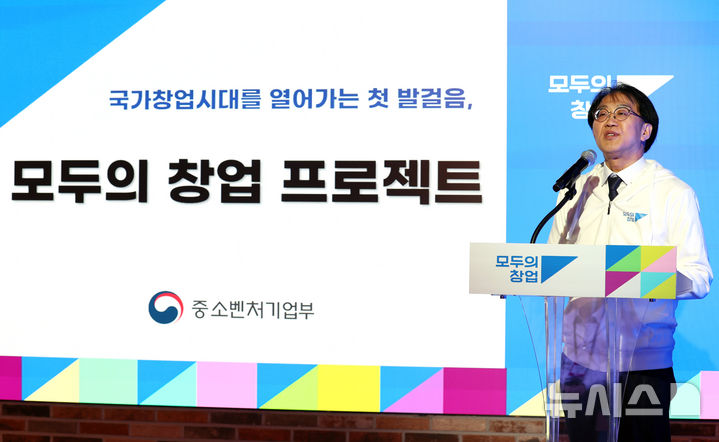 [서울=뉴시스] 이영환 기자 = 조경원 중소벤처기업부 창업정책관이 25일 오후 서울 서초구 드림플러스 강남에서 열린 모두의 창업 발대식에 참석해 모두의 창업 프로젝트 발표를 하고 있다. 2026.03.25. [email protected]