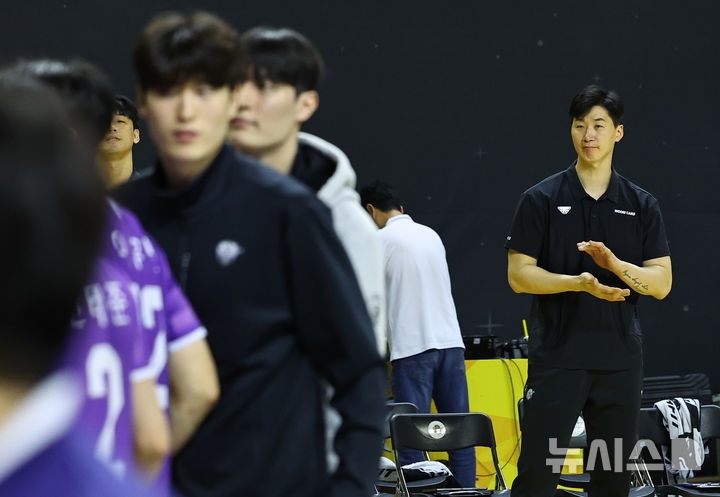 [의정부=뉴시스] 최진석 기자 = 우리카드 박철우 감독대행이 25일 경기 의정부 경민대학교 기념관에서 열린 2025~2026 V리그 준플레이오프 KB 손해보험과 우리카드의 경기에서 세트스코어 3-0으로 승리하며 플레이오프행을 확정지은 후 선수들을 바라보며 박수를 치고 있다. 2026.03.25. [email protected]