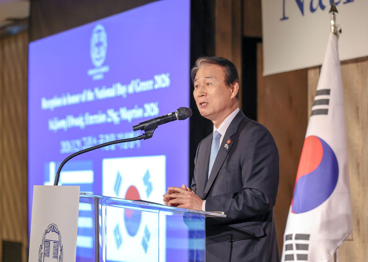[서울=뉴시스] 권오을 국가보훈부 장관이 25일 오후 서울시 종로구 포시즌스 호텔에서 열린 주한그리스대사관 국경일 기념행사에 참석해 축사하고 있다. (사진=국가보훈부 제공)