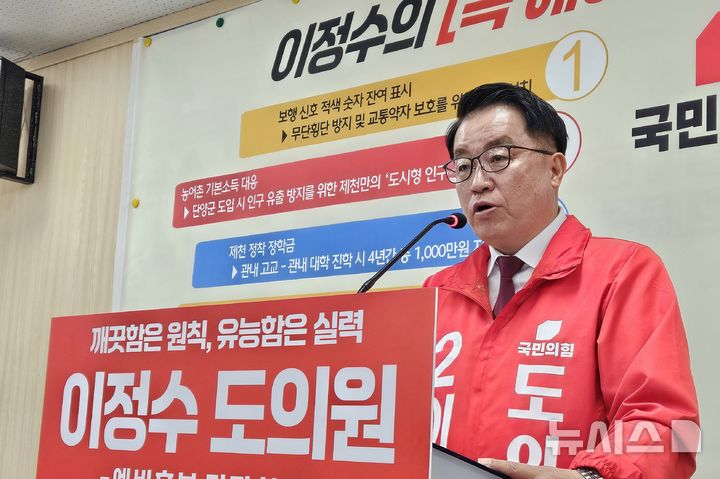 [제천=뉴시스] 이병찬 기자 = 이정수 충북도의원 선거 국민의힘 예비후보가 26일 제천시청 브리핑룸에서 제천 정착 장학금 신설 등 주요 공약을 발표하고 있다[email protected]