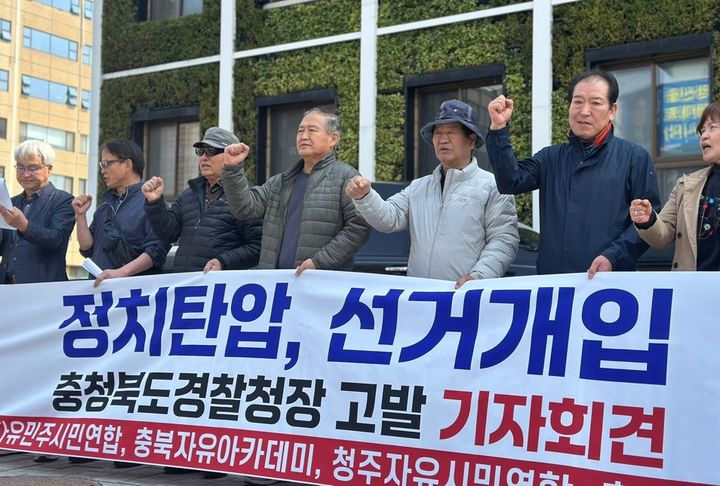 [청주=뉴시스] 서주영 기자 = 충북 보수성향의 시민단체가 26일 오전 도청 앞에서 충북 경찰을 규탄하는 기자회견을 하고 있다. 이들은 경찰이 김영환 도지사에 대한 수사를 통해 선거에 개입했다고 주장했다. (사진= 독자 제공) 2026.03.26. [email protected]