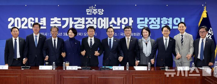 [서울=뉴시스] 조성봉 기자 = 박홍근(오른쪽 여섯번째부터) 기획예산처 장관, 한병도 더불어민주당 원내대표, 한정애 정책위의장 등이 26일 오전 서울 여의도 국회 의원회관에서 열린 2026년 추가경정예산안 당정협의에서 기념촬영을 하고 있다. 2026.03.26. [email protected]