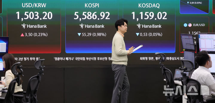[서울=뉴시스] 홍효식 기자 = 코스피가 전 거래일(5642.21)보다 48.15포인트(0.85%) 하락한 5594.06에 개장한 26일 오전 서울 중구 하나은행 딜링룸 전광판에 지수가 표시되고 있다.