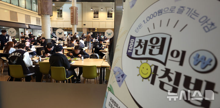 [인천=뉴시스] 전진환 기자 = 26일 오전 인천 연수구 연세대학교 국제캠퍼스 학생식당에서 학생들이 '천원의 아침밥'식사를 하고 있다. ‘인천형 천원의 아침밥 사업’은 인천지역 대학 재학생에게 아침식사를 1식 1,000원에 제공하는 사업으로, 지역 쌀을 지원한다. 2026.03.26. [email protected]
