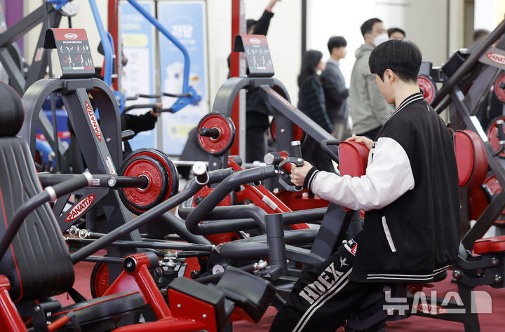 [서울=뉴시스] 김혜진 기자 = 26일 서울 강남구 코엑스에서 열린 2026 서울국제스포츠레저산업전에서 관람객들이 운동기구를 체험해 보고 있다. 2026.03.26. [email protected]