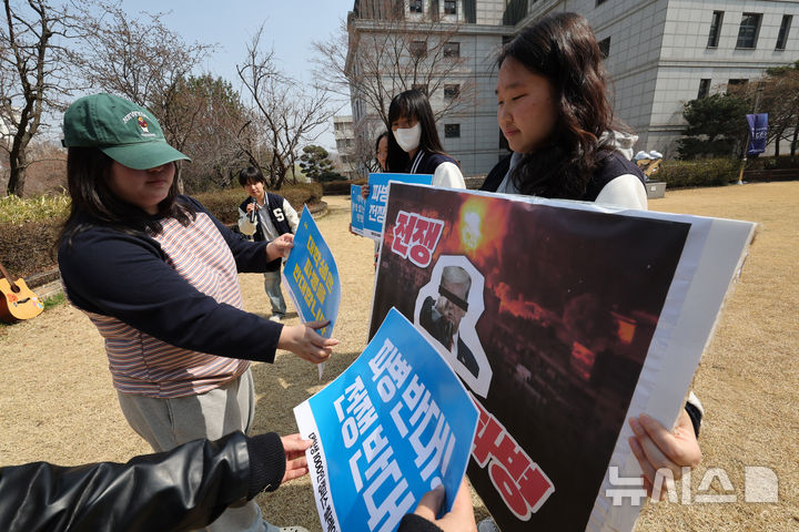 [서울=뉴시스] 배훈식 기자 = 숙명여자대학교 학생들이 26일 오후 서울 용산구 숙명여대 제1캠퍼스에서 2030정치공동체 청년하다 전쟁반대! 파병반대! 대학생 1000인 캠퍼스 릴레이 평화선언 퍼포먼스를 하고 있다. 2026.03.26. [email protected]